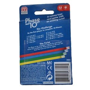 The product is a new, sealed Mattel Phase 10 Card Game suitable for ages 7 and up. It can be played by 2 to 6 players and is travel-friendly. The game involves strategy and is part of the card games category. It is themed around the character family of cards and was released in 2021.