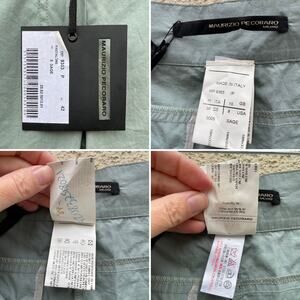 New with tags light sage green trousers pants by Maurizio Pecoraro Milano, size 8. Lightweight very smooth 100% cotton, straight leg, zip fly, pockets. Small pinholes near front belt loop and rectangle of sticker residue on back waistband, please see pictures. Laying flat measure about 15.5" across waist, 9" rise, 31" inseam, 9.5" leg opening.