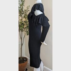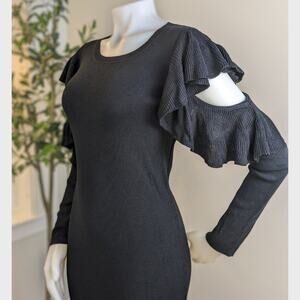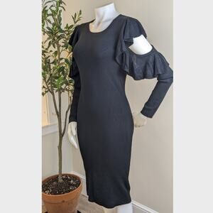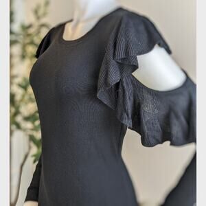 NEW WITH TAGS. Flattering and form fitting long sleeve cold shoulder black knit dress. The gorgeous soft ruffled knit sleeves elevate this dress making it a stand out! Tight knit.
