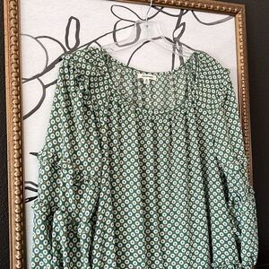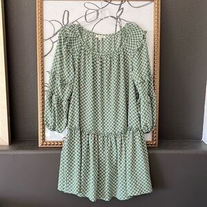 Max Studio Tunic Dress Women Floral Boho Ruffle Long Balloon Sleeve Beautiful vibrant kelly green with abstract blue yellow flower print Round neck drop waist tiered skirt