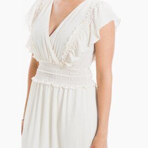 This elegant cream maxi dress features a flattering V-neck and delicate ruffle details. Perfect for any occasion, it offers a blend of style and comfort