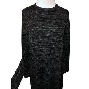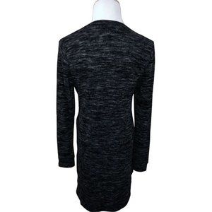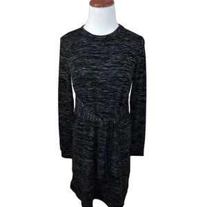 Marled black thin-knit sweater dress by Max Studio has a relaxed, cozy silhouette. Midi-length, below-the-knee dress has subtle black, dark grey and light grey marled stripe pattern, round neckline, long sleeves, and self-tie at waist front. 88% Polyester / 9% Rayon / 3% Spandex. Dry clean only.