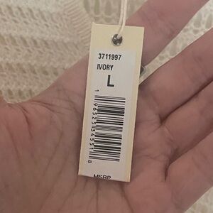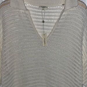 Airy stitched lend breezy appeal to a knit polo sweater fashion with a collared V-neckline. New with tags. Meant to fit oversized.