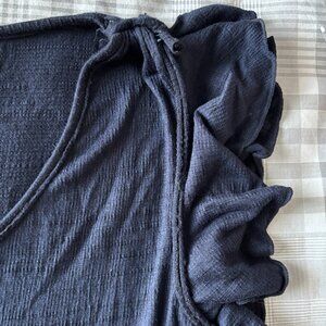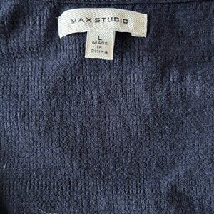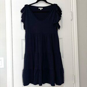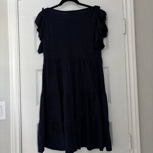 New, never worn! Max Studio cobalt (navy) ruffled tiered mini dress, slip-on styling, 95% Rayon, 5% Spandex, size L but can fit some XL. See actual photos for truer color (dark navy).