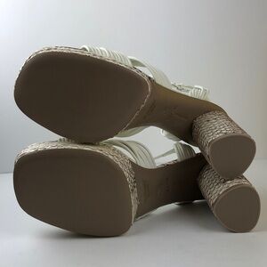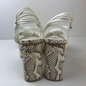 New without tags in box. These cute platform heels are made of leather, they have a strappy rope like style, a scale snake print, an open toe, an ankle strap and a buckle closure. They have some very minor wrinkles near the buckle. They are very chic and on trend. Come from a smoke free home.