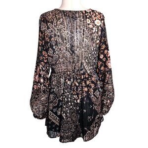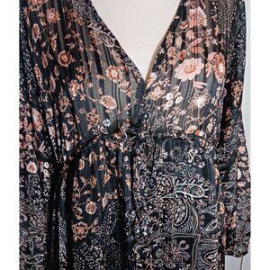 NEW Metallic Paisley Plunging V-Neck Mini Dress, Black Multi, M, Bohemian Style