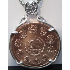 Since its debut in 1982, the Mexican Libertad has stood as a global symbol of freedom, beauty, and national pride. With its graceful portrayal of the Winged Victory against the backdrop of Popocatépetl and Iztaccíhuatl, and its proud display of the Mexican coat of arms, the Libertad has captivated collectors for over four decades. This necklace honors the artistry and legacy of the original coin with stunning fidelity and modern craftsmanship. The obverse features the Winged Victory in full stride atop her column, the majestic volcanoes rising behind, framed by the inscriptions 1 ONZA COBRE PURO, the year of issue, and LEY .999. The reverse pays homage to the Mexican coat of arms in its current form, encircled by ten historic variations used throughout the nation’s history, all struck with crisp, brilliant uncirculated detail. Around the center, the inscription “LIBERTAD TRIBUTE,” “INTAGLIO MINT.”