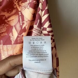 Miaou Ginger Red Wanted Magazine Print Draped Mini Dress. Sleeveless. Pull on styling. Unlined. Draped neckline. Sheen satin fabric with magazine cover design throughout. Peach and maroon red coloring. Size large.