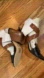 MK Adrianna heels in a beautiful tri-color combination. Colors are black, luggage and cream. Criss cross strap with side gold buckle. Soft leather and snakeskin upper.