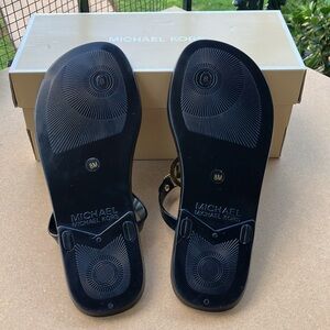 NEW with box. Unworn Michael Kors MK Jelly Sandals. Size 8. Black with Gold medallion. Style 45U9MKFA2Q. Looking for my forever home.