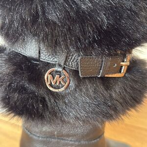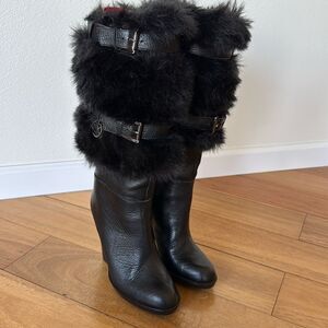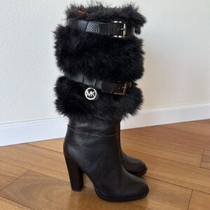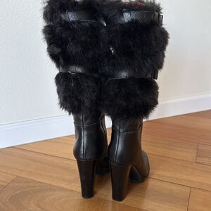 NEW. These are leather with faux fur. They are 18” tall including a 4.5” heel. Calf circumference is 12”.