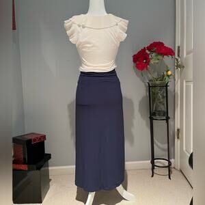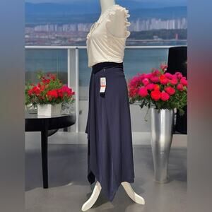 Show a little leg in this New with tags Hi Low Asymmetrical Hem Jersey Knit Skirt with Waterfall pleating at front waist by Michael Kors. Navy. Sz XS. Elastic Waist.