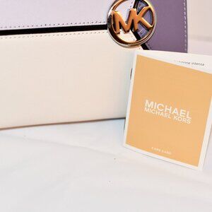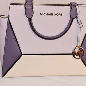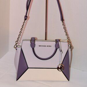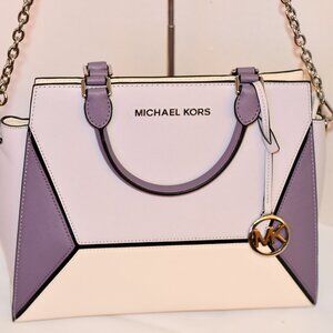 Add a bold pop of modern style to your collection with this brand new with tags Michael Kors Prism Large Satchel in the eye-catching Orchid HZ Multi colorway. Crafted from high-quality leather, this structured handbag features color-blocked lavender, cream, and deep purple tones with silver-tone hardware and a chain strap detail. A stunning and functional statement piece.