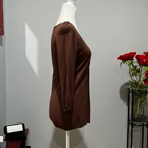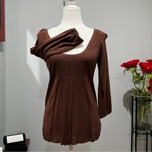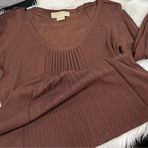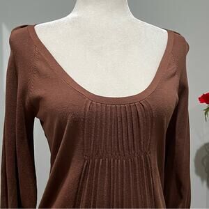 New without tags Gorgeous Longline Smocked and Draped Classic Romantic Princess Pleated Fit and Flare Swing Style Knit Sweater Top by Michael Kors. Darted Bust. Wide Scoop Neck. Pleated Bell Sleeves with Elastic Cuffs. Chocolate Cocoa Brown. Size Women’s XS.