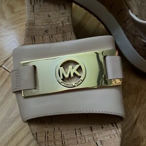 New! Michael Kors Warren pink leather logo slides with cork bottom. Heel approximately 2.5 inches high. Slight scuff on gold logo on left shoe (see last photo) size 8.5 sorry no box.