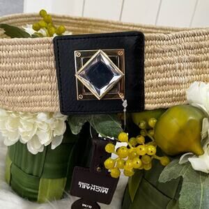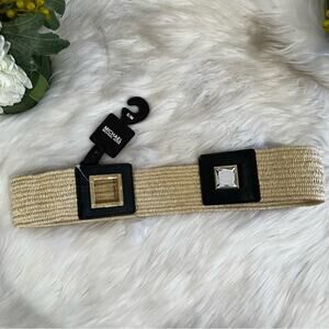 New with tags Gorgeous Neutral Beige and Black Woven Wide Stretch Waist Belt with Square Crystal Turn Latch Clasp by Michael Kors. Gold Hardware with Michael Kors Insignia. Synthetic Base and Back. 2.5” Width.