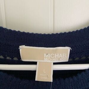 Women’s Michael Kors sweater. Sweater is dark blue in color & made of a soft knit material with decorative fringe fabric design. Size large. Smoke free home!