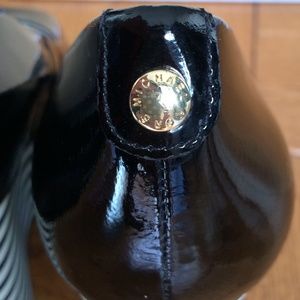 New, never-been-worn chic-yet-comfy Michael Michael Kors Adalia peep-toe wedges in black patent. Leather upper and rubber sole. Wedge heel is about 4.5 in. and platform is about 1.25" in. Comes with original MK shoe box. True size 7.5.
