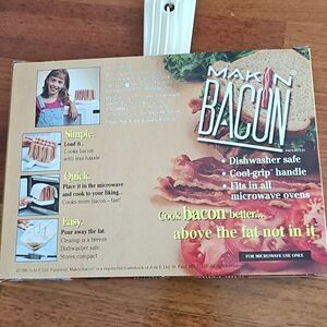 Cook healthier bacon with the Microwave Bacon Cooker. This white cooker elevates bacon above the fat for a leaner meal. Perfect for quick and easy breakfasts.