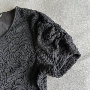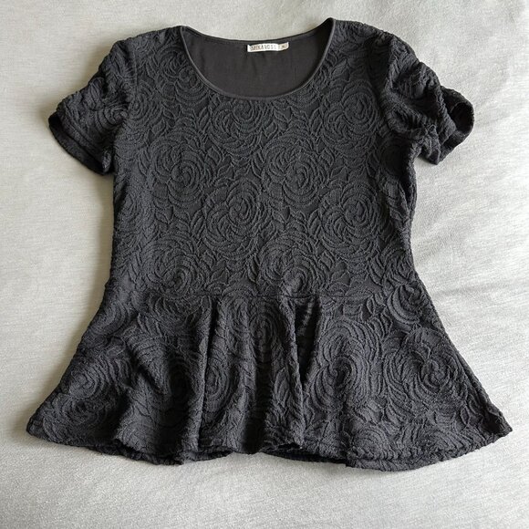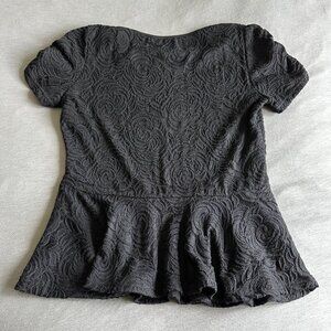 Mikarose Peplum Short Sleeve Top in black. Adorable peplum top with crew neck and textured rose pattern.