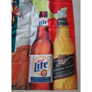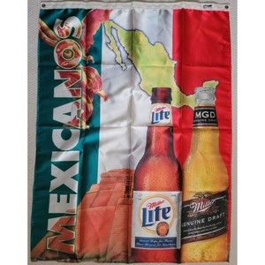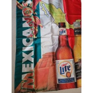RARE! Measures 47.5" x 36" Brass grommets for secure hanging One sided Features Miller Lite and Miller Genuine Draft bottles with an Aztec pyramid, with the backdrop of the Mexican flag "MEXICANOS" along the left border with the country of Mexico in the center!