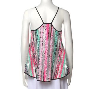 This is truly a unique piece by this designer. It features a slightly high-low hem with spaghetti straps that are not adjustable. The inside on the front is fully lined. The back is not and has sheer areas where you can see through. The material is a little stiff, I almost want to say like a burlap feel, and it includes multicolored stripes of white, neon pink, neon green, black, and silver—a truly unique piece. I’ve never seen anything like it, and you’ll make a statement wearing it to any special occasion or even throw it on over your bathing suit poolside or at the beach. The tag says small petite, but please take a look at the measurements, and it does have a bit of an oversize boxy feel to it.