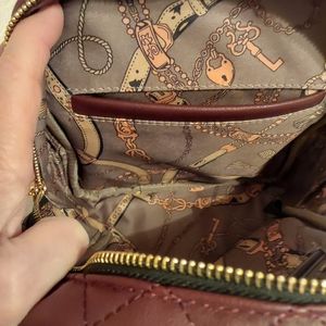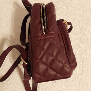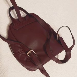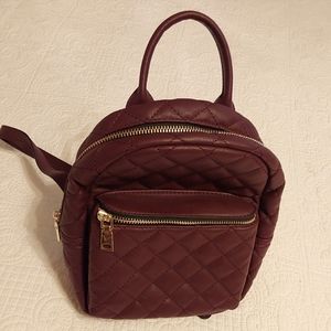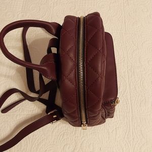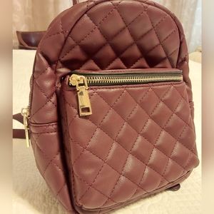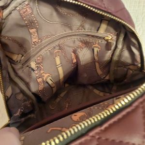 This mini backpack/purse is brand new! Never used! Color is a redish-brown/burgundy color. I don't know the maker because tags were removed. Quilted leather look. Gold hardware. It measures approx. 9.5 x 9 x 4. Carry handle plus 2 long adjustable straps for backpack use. Please feel free to ask questions.