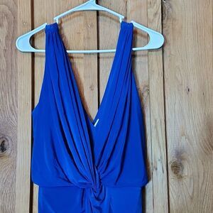 This statement crossover dress is sleeveless with a v-neckline in front & back and figure flattering cinching through the waist and hips. In a striking royal blue, pair this dress with glittering heels or black stiletto for an evening to remember.