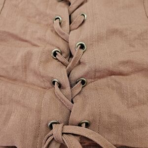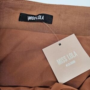 Miss Lola sexy mini skirt. Color is a reddish brown (stock picture is more tannish than true color).Adjustable lace-up front tie. Side zipper close. Fully lined.