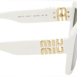 Stylish Miu Miu sunglasses with bold black frames. Gold accents add a touch of luxury.