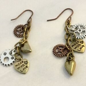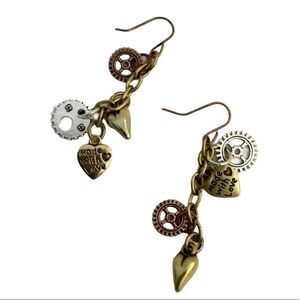 NEW Multi Metal Hanging Earrings. Mix metals, Gears, hearts charms in Antiqued silver bronze brass gold tones.