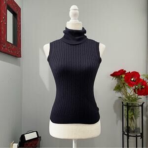 New without tags Vintage Y2K Silk Longline Academia Bookbinder Cable Knit Cardigan Duster and Sleeveless Turtleneck Layering Sweater Set by Moda International. Long Sleeve Button Front Cardigan with V-neck. Sleeveless Turtleneck Top with Lightly Ribbed Neck and Hem. Fitted; With Some Stretch. Women’s Size XS. Navy Blue.
