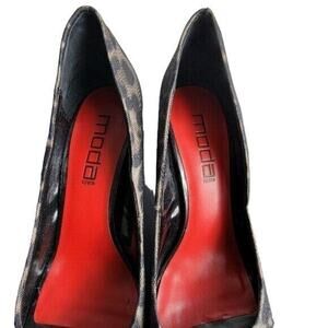 Step out in style with these chic Moda Spana peep-toe pumps! These heels feature a beautiful black and tan animal print pattern and eye-catching red soles. Perfect for adding a touch of elegance and sexiness to any outfit.