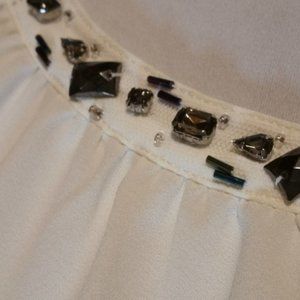 Modamix by Brandon Thomas White Short Sleeved Blouse with Bead & Rhinestone. Detailed Neckline with Jeweled Silver Hardware Rhinestones.