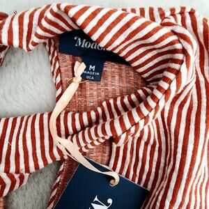 Fatures bold orange and white stripes, a flattering wide-leg silhouette, and a playful mock neckline with cutout details. Made from a soft stretch knit, it’s perfect for dancing through summer days or layering into fall.