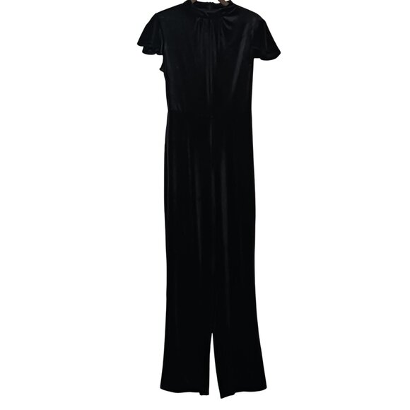 Keywords: jumpsuit, black velvet, mockneck, ruffle sleeve, pleated design, stretch fabric, elegant, ModCloth, flutter sleeve, XS size, women's fashion, evening wear, chic outfit