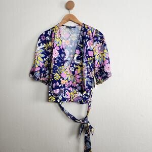 NEW Modcloth Wrap Top V-Neck Bell Sleeve Graphic Print Navy Blue XS