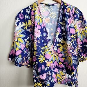 Modcloth Wrap Top, Graphic Print Shirt, V-Neck Surplice, Navy Blue Multicolor, Bell Sleeve, Side Tie Closure, Vintage Inspired, Mushroom Floral Star Print, Rayon Flowy Top