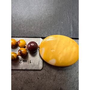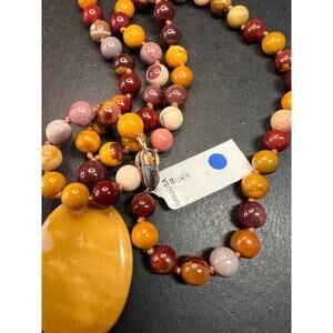 Genuine mookaite jasper round beads measuring about 8mm knotted in between each one on a brownish mauve cord with a yellow Mookaite oval pendant hung from the center and a 925 sterling silver lobster clasp. Measures about 24 inches. AlumaUSA.
