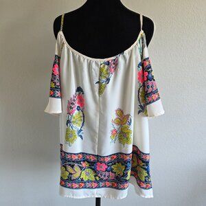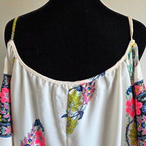 New (with tags) pretty semi sheer blouse - cold shoulder with short sleeve - bright artsy floral print