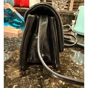 • Sleek black patent leather with iconic gold-tone “M” logo.