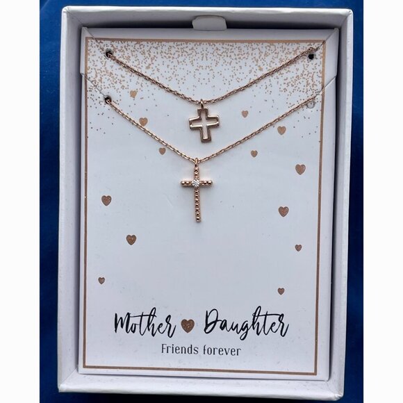 Styled in rose gold-tone metal, these necklaces feature cross pendants accented with pavé crystals and cubic zirconia. This exquisite duo comes boxed and ready to be gifted to your favorite mother-daughter duo, sisters, or best friends.