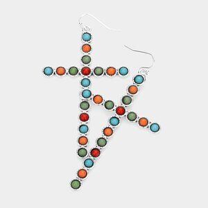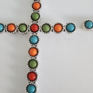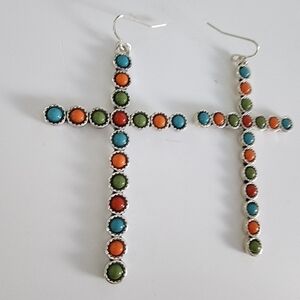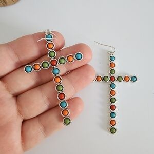 Amazing antique metal multi stone cross earrings. Bohemian.
