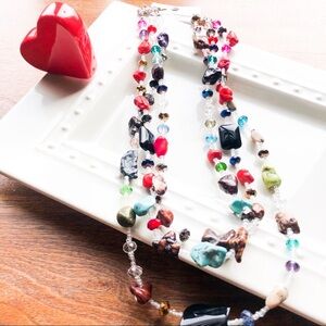 Beautiful vibrant colors run through this necklace. Two layers are the same length and one is a little longer.