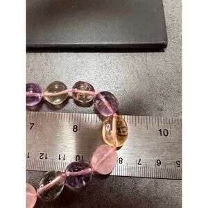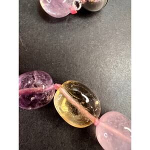Genuine quartz chunky beads in rose quartz, amethyst, Prasiolite, and citrine. Knotted in between each bead on pink cord, with a 925 sterling silver unbranded magnetic clasp for easy removal and dressing. Measures 18 inches in length and weighs 3.6 grams.