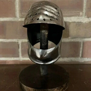 This handcrafted miniature replica of a Maximilian style armet (circa 1500-1540) is similar of those worn during the reign of Emperor Maximilian. It features an elaborate fluting distinctive of the type and a visor that can be raised. It comes with a real wooden stand.