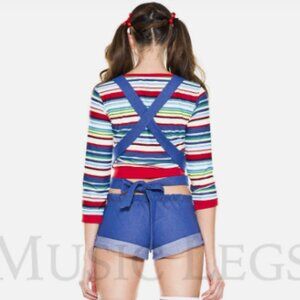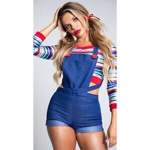 Invoke terror in this Nightmare Killer Doll costume featuring blue overalls with criss-cross straps, red button accents, a strappy bodice with a tie back closure, a cheeky cut back, a striped, multi-colored crop top with 3/4 length sleeves, and red hair bows. (Stockings not included.) Please note some stock images have overalls without the "Wanna Play" logo but these photos are for fit/style purposes. This costume has the Wanna Play Logo on front.