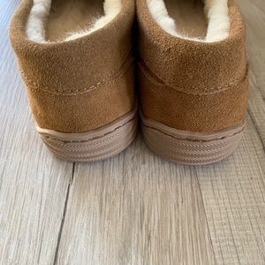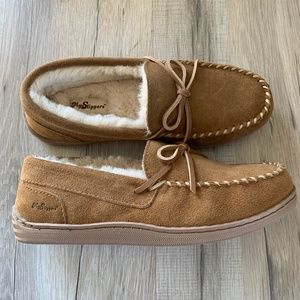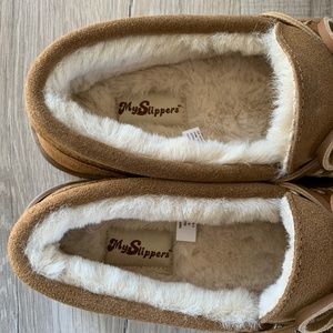 New without tags/box My Slippers 4 tier cushioning system tan suede leather slip on faux fur sherpa shearling lined hard sole moccasin loafer slippers. See photos for details.