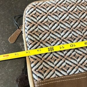 New with tags Mac book sleeve. This laptop sleeve is designed to carry and protect laptops, specifically fitting Mac Book. It features a distinctive blue patterned canvas design on the upper portion, combined with a brown leather-like material on the lower section and trim, secured with a zipper closure. The sleeve is described as having a snug lining to protect the device.