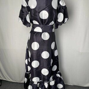 Nancy Yang Women’s Maxi Dress Black/White Size L Polka Dot Ruffle Belted